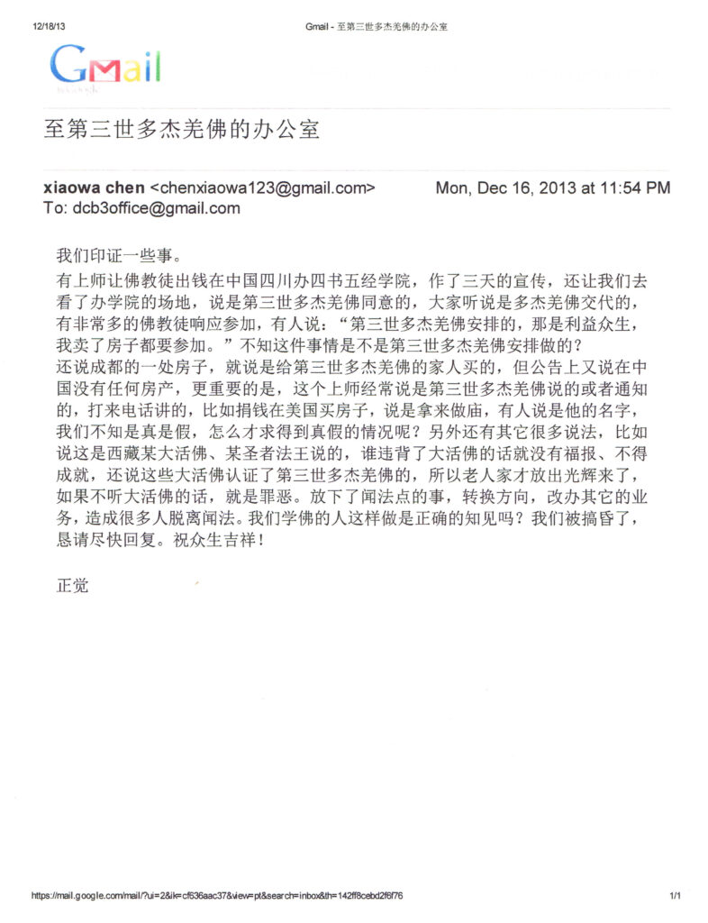 五、 你们来信中提到的那个上师於2013年12月17日到了美国洛杉磯,H.H.第三世多杰羌佛对他说:“这些反映问题的信给你看看,信中说你拿了別人的財物和一些其它问题,如果你拿了別人的財物就还给人家,有了就改,如果没有拿,別人说什么你就忍辱。我为什么不收任何人的供养?来到这个世界是给眾生带利益来的,別人怎么说,我都忍辱对待。”这位上师对H.H.第三世多杰羌佛说:其他的人怎么说,他无所谓,因为他的心中幹乾净净,是光明的,欲加之罪,何患无辞?他只对老人家说,他们终於给了他一个讲话的机会,这些写信来的人是说假话冤枉他。他当下跪地发誓说:他假如打了H.H.第三世多杰羌佛的牌子敛供养,他全家就在今天晚上死绝。他没有骗过任何人的一分钱或財物,而是帮助了那些人。他说他从来没有说过假话,也没有叫过人说假话。四书五经学院不是他办的,是由两个教授来办,他只是去了一下,讲了几句话,他没有让大家去贊助,也没有说过是H.H.第三世多杰羌佛同意、安排的。他特別几次表明说,他今后要做的事是增加闻法点,从零开始,与大家一起闻法,不做其它的事。H.H.第三世多杰羌佛没有在电话裡说过“我都信任你们的上师,我都赞叹你们的上师,你们为什么不信任他?”是那些听电话的人编假话,是在冤枉他。至於在美国买房,“从来没有募捐,那是美国有些人自愿出了少部分的钱,我出了多的钱。现在已经申报了一个能作禪修的许可。让他们把房子卖了,退还钱给他们,”在成都买房,从来没有借用H.H.第三世多杰羌佛的名义买,也没有用任何人的钱来买,是他自己用200万元从薛永新(办公室注:薛永新善德是恩威集团的董事长)那裡买的自己的財產。他为以上所说几次发誓担保:如果有这些事,他和他全家在今天晚上死绝。