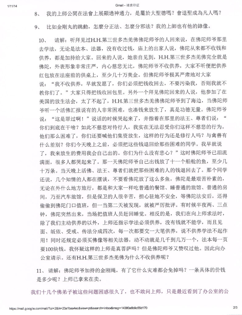 第十、關於供养的问题,真正的供养是真心修行学佛、如法依H.H.第三世多杰羌佛的教法奉行,自觉成就而觉悟他人,利益一切眾生。弟子適当的对传法上师作一些供养是应该的,如果自己生活困难,不但不应该作供养,而且上师应该拿钱帮助。但任何上师都无权喊弟子对他作供养,更不应该要弟子买任何法物,让弟子买任何法物是绝对不应该发生的事情,有此行为即是凡夫自私贪得之心,离菩萨的路程太遥远了。
